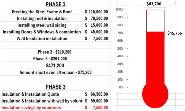 To complete phase 3 we need to raise roughly $63,700 on top of the $400,000 construction loan we took out. We have raised $45,766 (about 72%) of that amount to date. We will then need to raise more money to buy materials to frame the inside walls and keep moving forward.