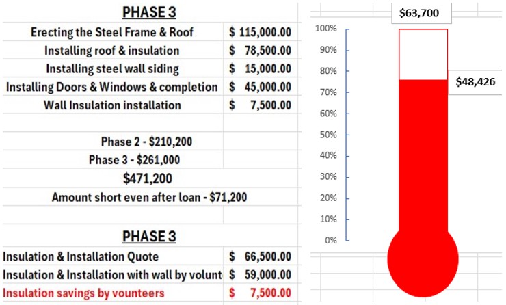 To complete phase 3 we need to raise roughly $63,700 on top of the $400,000 construction loan we took out. We have raised $48,426 (about 76%) of that amount to date. We will then need to raise more money to buy materials to frame the inside walls and keep moving forward.